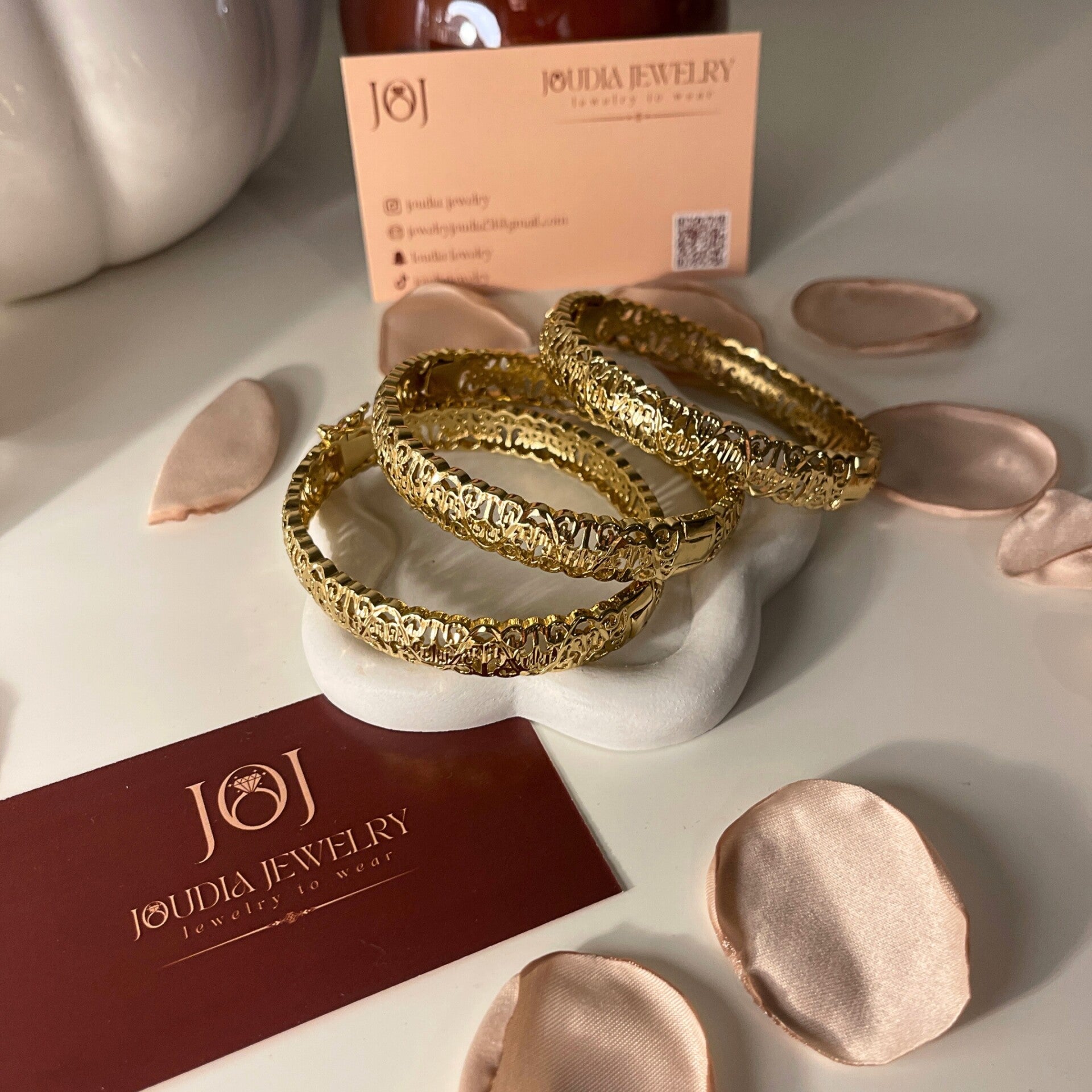 Chaque bracelet présente des motifs ajourés élégants qui captent la lumière et subliment le poignet avec raffinement. Leur éclat doré apporte une touche chic et féminine, parfaite pour les grandes occasions ou pour un look sophistiqué au quotidien.
